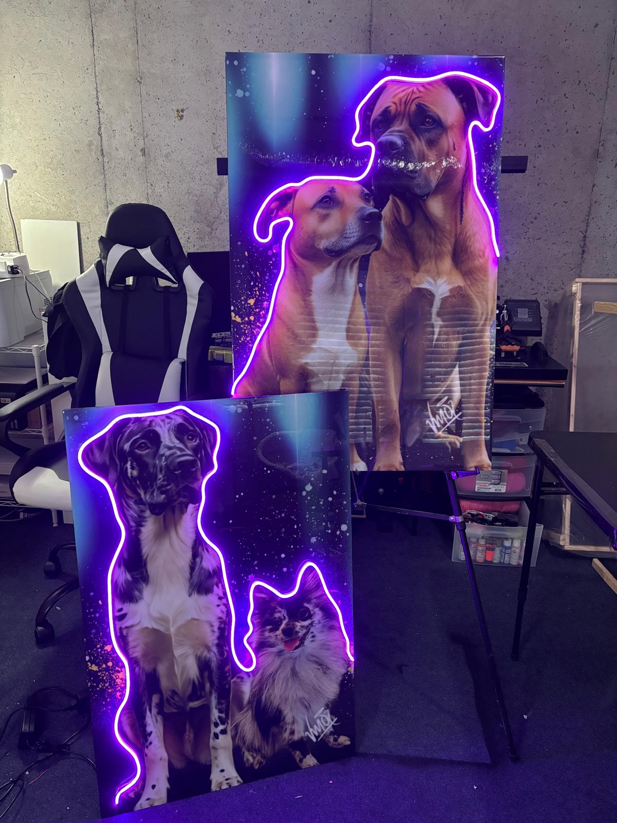 La pieza es intervenida con resina epóxica y luz neón (OPCIONAL), creando un acabado brillante y un efecto luminoso moderno que realza la imagen y la convierte en una pieza decorativa única.